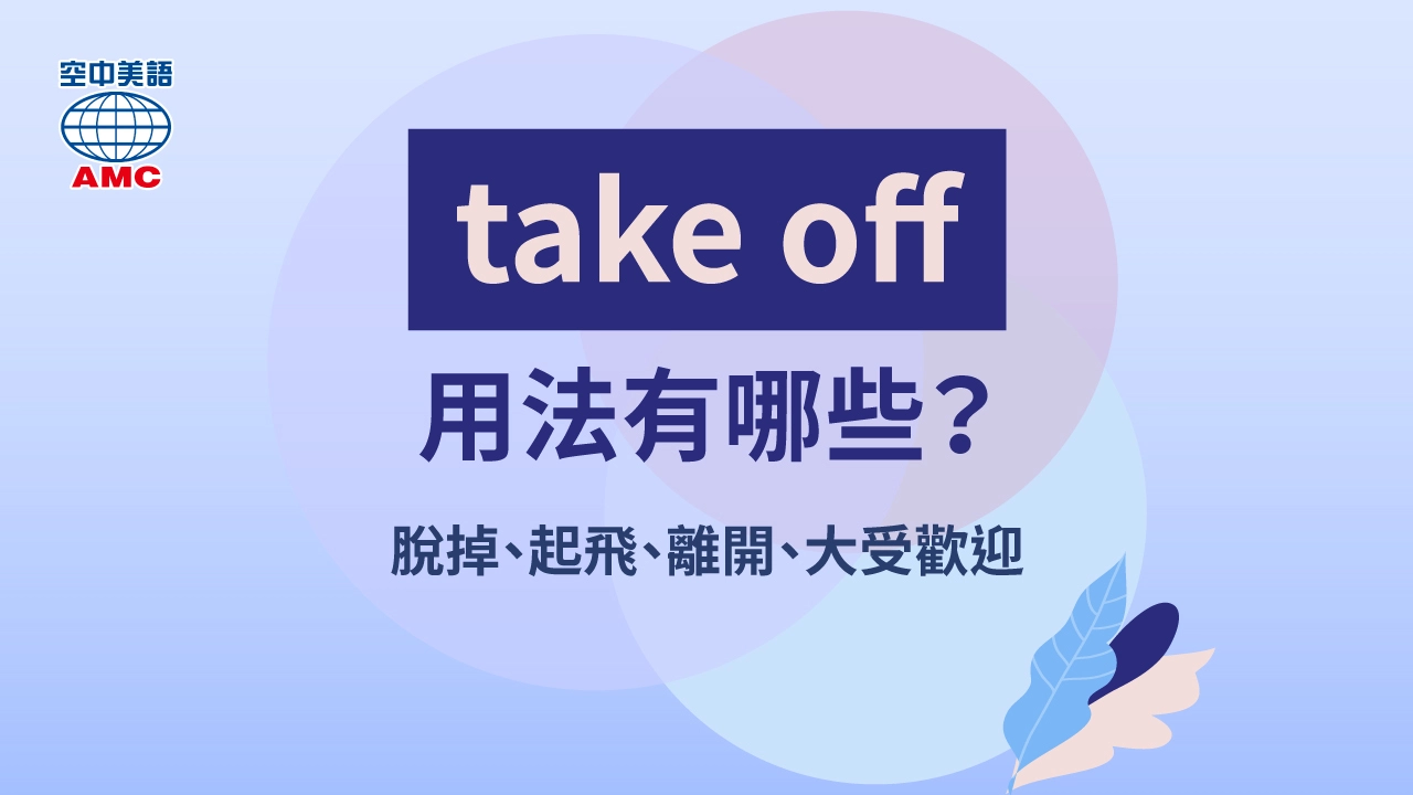 「take off」這片語主要的意思是”離開”,飛機從地面離開(起飛)、開始走紅或是某人從某地離開都是「take off」的衍生意思...