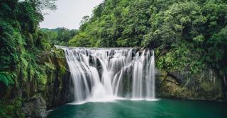 像一襲白色綢緞的十分瀑布,墜入一大片寬廣深潭,瀑水形成的水氣經常彌漫在瀑潭上方,經陽光照射,便呈現出一道彩虹,顯現出晴空霓虹璀燦奪目,故有彩虹淵的美名。